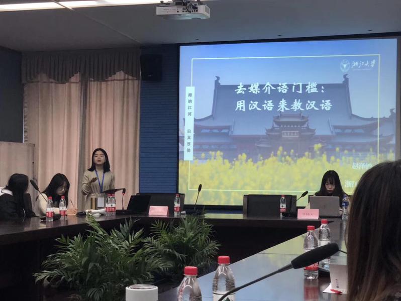 会上,浙江大学学生代表,19级汉硕研究生赵泽钞同学与汉语国际教育16级汉语国际教育本科生徐恬分别分享了各自的教学经验和研究成果。在主题为“汉语教育与中国文化传播”的分论坛中,赵泽钞同学发表了题为“关于汉语作为第二语言教学课堂中遇到的一些问题——以“联合国班”汉语课程设置为例”的报告,就“联合国班”中以英语作为唯一媒介语展开教学的合理性这一问题与中山大学周小兵教授和在座各兄弟院校同学进行讨论。在主题为“汉语国际教育专业素质、需求及创新创业”的分论坛中,徐恬同学发表了题为“面向汉教专业的跨文化传播能力培养与相关课程设计”的报告,她建议,对外汉语教育专业除了基础理论的学习,还可以设计一些以学生为主体的课程来提高汉教专业学生跨文化交际的实践能力,如通过加强中国学生和留学生合作的方式来促进中外学生相互文化交流,更直接地感受不同国家之间的文化异同等,并对此类课程可能有的效果进行了初步预设。