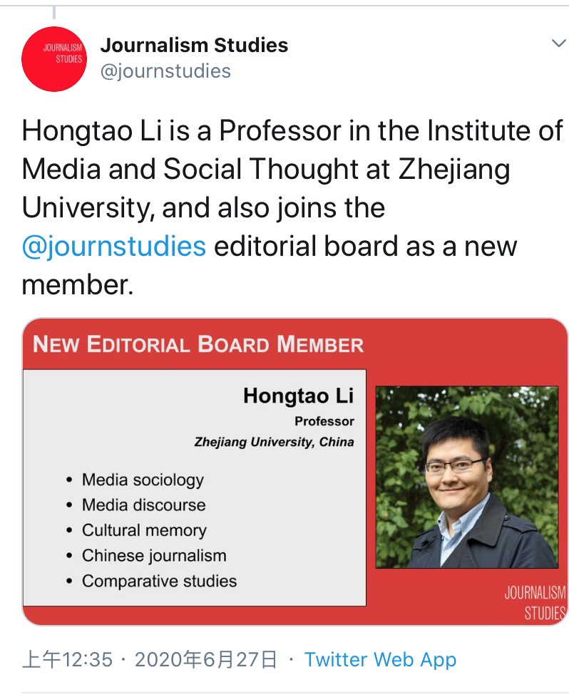 近日,168体育 李红涛老师受邀担任国际知名学术期刊《新闻研究》(Journalism Studies)编委会成员,成为该刊编委会来自中国大陆学术界的两位编委之一。