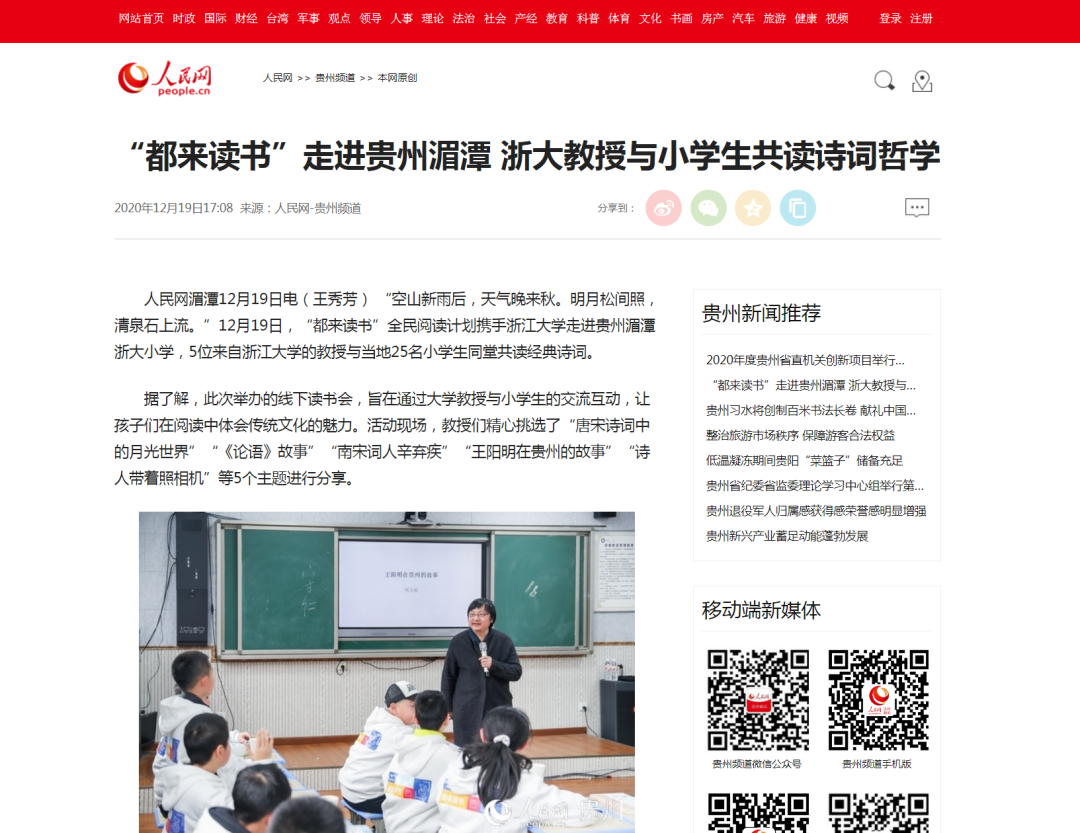 12月19日,“都来读书”全民阅读计划携手浙江大学走进贵州湄潭浙大小学。5位来自浙江大学人文168足球 、168足球 的教授,与当地25名小学生同堂共读人文经典,其中,来自168足球-168体育 的胡志毅教授讲述了“王阳明在贵州的故事”,江弱水教授则以“诗人带着照相机”为题带孩子们领略了诗歌的魅力。