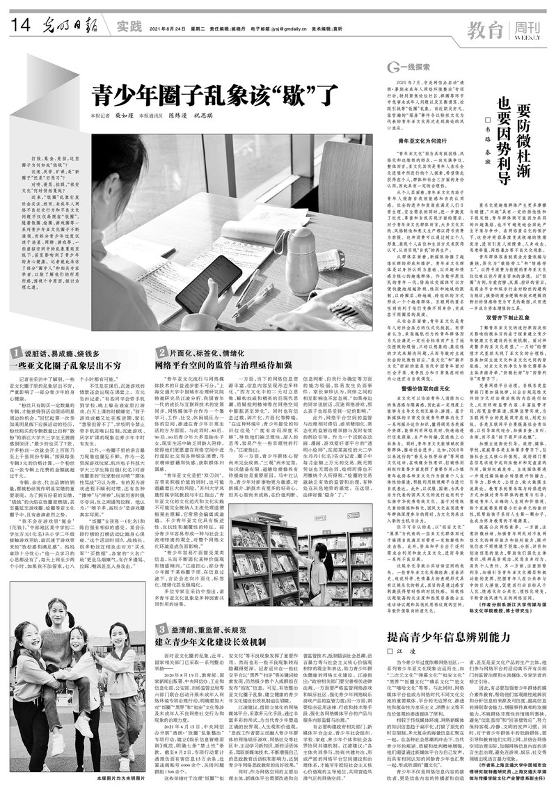 提高公众网络素养。一方面,注意防微杜渐,加强青年网民对不良网络文化的辨别能力和批判能力,提升他们在不同情境下获取、分析、评价和创造信息的能力,帮助他们强化主体意识、明辨是非观念、反思自身行为、肩负个人责任。另一方面,注重因势利导,加强引导青年亚文化圈层积极功能的发挥,挖掘青年人在公共参与中的巨大潜能,促使其行动目标从个人化、情感化向公共化、理性化转变,不断营造风清气正的网络空间。