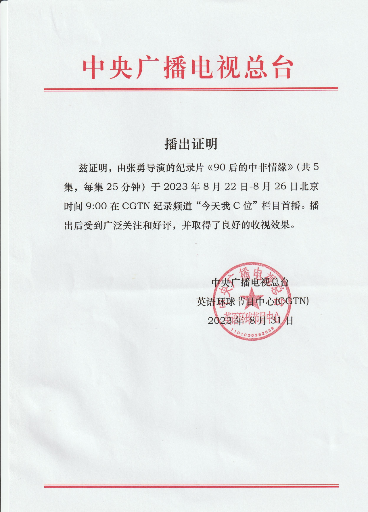 (《90后的中非情缘》英语版在南非CTV电视频道播出)