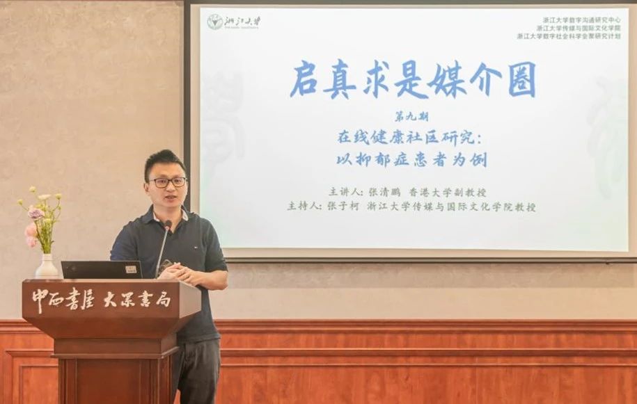 2024年5月13日下午,由浙江大学数字沟通研究中心与168足球-168体育 共同主办的“启真求是媒介圈第九期学术沙龙”在中西书屋·大众书局(浙江大学校园书店)举行。香港大学数据科学研究院和药理及药剂学系副教授张清鹏发表题为“在线健康社区研究:以抑郁症患者为例”的讲座,讲座由浙大168足球 教授张子柯主持,浙大168足球 文科资深教授、数字沟通研究中心主任黄旦,浙大168足球 百人计划研究员黄清与王可欣及数十位师生聆听交流。