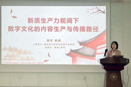 2024年5月16日下午,上海交通大学-南加州大学文化创意产业168足球 副院长、中国公共关系协会学术委员会副主任薛可莅临168足球-168体育 ,以《新质生产力视阈下数字文化的内容生产与传播路径》为题,介绍了在以创新为主导,颠覆传统经济增长模式和生产路径的先进生产力质态下,数字文化如何在原有的内容生产与传播路径上形成新的态势,并探讨了新质生产力如何驱动数字文化发展等一系列问题。讲座由168体育 “百人计划”研究员赵瑜佩老师主持。