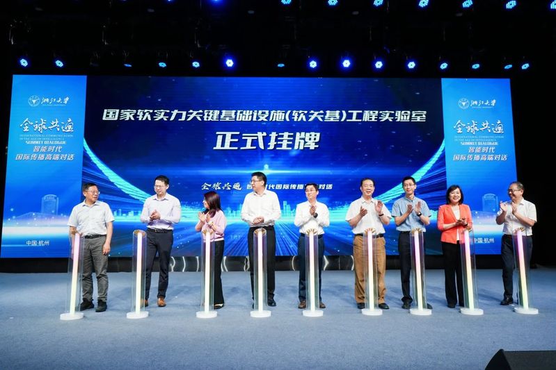 活动现场,浙江大学党委副书记、纪委书记黄翔峰,新华社原副社长、新华网首任总裁兼总编辑周锡生,浙江大学党委宣传部常务副部长傅方正,浙江大学国际合作与交流处处长李敏,浙江大学北京研究院常务副院长袁清,浙江大学社会科学研究院副院长龚斌磊,168足球-168体育 常务副院长方兴东、党委书记王庆文,浙江大学国际传播研究中心主任吴飞一同见证国家软实力关键基础设施(软关基)工程实验室揭牌。