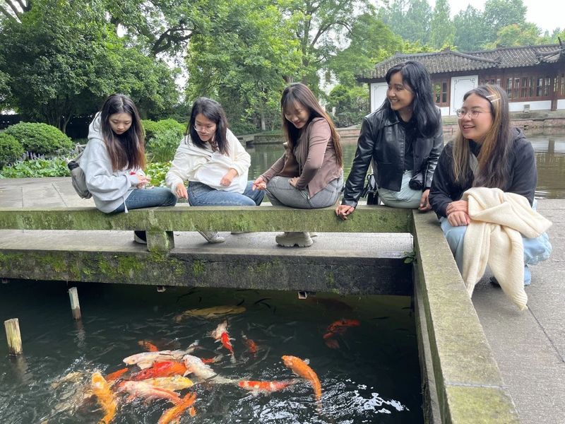 同学们在郭庄中赏浙派园林风景并拍照留念,远眺西湖与苏堤相望,喂鱼猜字,感受浙派园林与中式魅力。此外,近年来郭庄多次举办以浙派盆景为主的系列盆景展。同学们在游览郭庄的同时也耳濡目染了这独具特色的盆景艺术和文化。