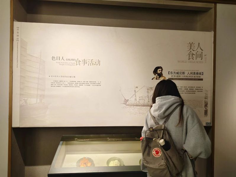 在展柜中,各式各样的生动杭帮菜模型向留学生同学们展示了杭帮菜的种类菜式和外形,给同学们留下了有关杭帮菜的独特印象。展馆中还向大家展示了杭州饮食文化在历史上与海外的交流互通。著名的《马可波罗游记》记载,“马可·波罗游历杭州,展现在眼前的是繁华的杭州市井风貌,市区里拥有野味猎物(鹿科动物、野兔、野滩、雁、鹧鸪、鹌鹑)、畜禽(鸡、鸭、鹅、牛、羊)、腌腊、水鲜(江海鱼蛤)、干鲜果、时蔬等市场,酒肆、茶坊、店铺鳞次栉比……”这体现了当时杭州市的食材原料之多,美食种类之广。在“海禁”结束之后,古代中国对外贸易达到了历史高峰,玉米、番薯、马铃薯、辣椒、花生、番茄、南瓜等一大批海外食材相继传入杭州及江浙地区,极大地丰富了杭州人的餐桌,有力地促进了杭帮菜的发展。通过参观杭帮菜博物馆,党员与留学生同学们了解到杭帮菜的起源、发展与繁盛,并对杭帮菜的经典菜系有了更多的认识。学习的最后,同学们在这里品尝到了各种经典的杭帮菜,亲身体验了杭帮菜的魅力。