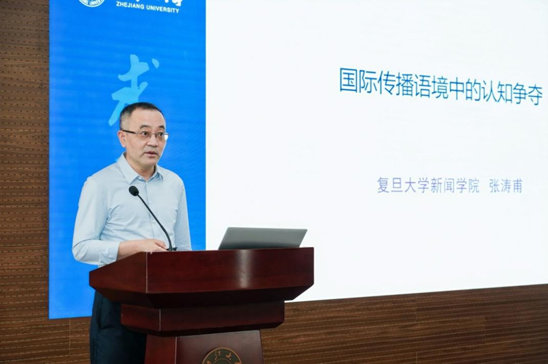张涛甫教授以“国际传播语境中的认知争夺”为题,从学理角度深入阐述了人的认知有限性与传播的偏向,指出人们对周围世界的理解依赖于内化于个体的意识形态框架。在全球范围内普遍存在着认知争夺的现象,他以美国的“认知战”战略为例,重点分析了美国对华的话语策略和意识形态框架,并从知识、价值、规则的维度提出了改变以西方为中心的全球认知的三大支点,强调了这些支点的应用和实践。