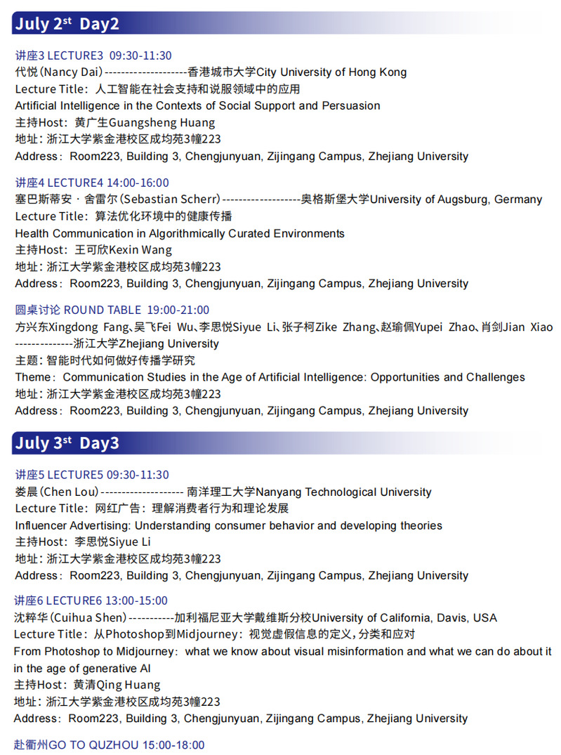 自2004年起,168足球-168体育 已连续举办十五期“国际前沿传播理论与研究方法”高级研修班。研修班最初由浙江大学吴飞教授、威斯康星大学潘忠党教授、宾夕法尼亚大学杨国斌教授联合发起,通过采取海内外名校教授授课、主题互动以及论文研讨相结合的形式,旨在深入探讨国际传播学界所面临的重大问题,推动相关研究领域的理论和方法创新,共同应对全球变局的挑战。今年首次与清华大学、浙江省衢州市衢江区人民政府合作,聚焦人工智能时代为传播学研究与实践带来的机遇和挑战,开展研讨交流。