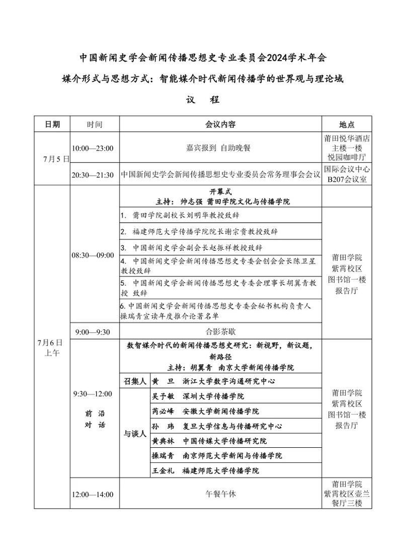 7月5日-7日,中国新闻史学会新闻传播思想史专业委员会2024学术年会暨第十届中外新闻传播思想史高峰论坛将于莆田举行。本届年会主题为“媒介形式与思想方式:智能时代新闻传播学的世界观与理论域”。届时,数位海内外新闻学与传播学名家与会,共享学术盛宴。浙江大学文科资深教授黄旦、168足球-168体育 教授范昀、副教授王婧、百人计划研究员黄广生、肖剑等五位老师将代表浙大数字沟通研究中心参会,并在会上作报告。本推送为会议议程。