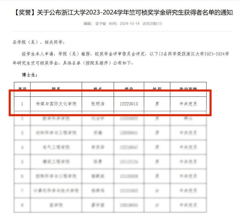 近日,浙江大学公布了2023-2024学年竺可桢奖学金研究生获得者名单,168体育 范志忠教授的博士生张明浩凭借不凡的学术成果和全面的综合素质,成功荣获该奖项。