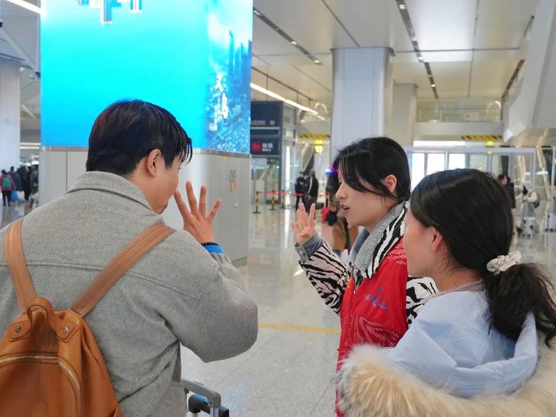 换上红马甲,佩戴工作证,传媒学子化身“西站向导”,分散至站内各点位。在安检口与人流密集处,他们是指引方向的“活地图”;跟随安保人员穿梭于摆渡车与站台间,他们成为随时补位的“螺丝钉”。其中,两位学生遇到了第一次来杭州的外国友人,读不懂指示牌,更是孤身一人,但在手机翻译的辅助下,他们成功跨越语言障碍,准确引导外国友人前往其目的地。