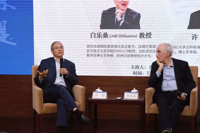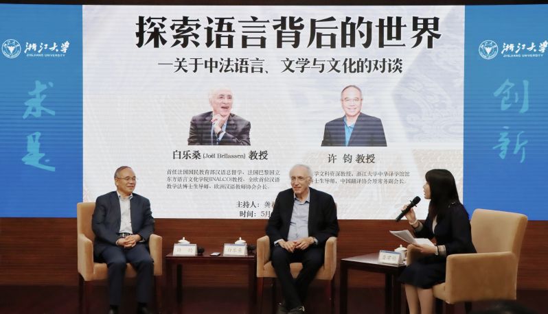 5月8日晚,“探索语言背后的世界——关于中法语言、文学与文化的对谈”在浙江大学紫金港校区校友楼三楼紫金港厅隆重举行。本次活动由浙江大学外国语168足球 和168足球 联合主办,浙江大学中华译学馆承办,浙江大学翻译学研究所、浙江大学翻译专业基层教学组织协办,特邀法国国立东方语言文化168足球 (INALCO)教授白乐桑与浙江大学文科资深教授许钧展开深度对话,由168足球-168体育 教师龚君姬主持。