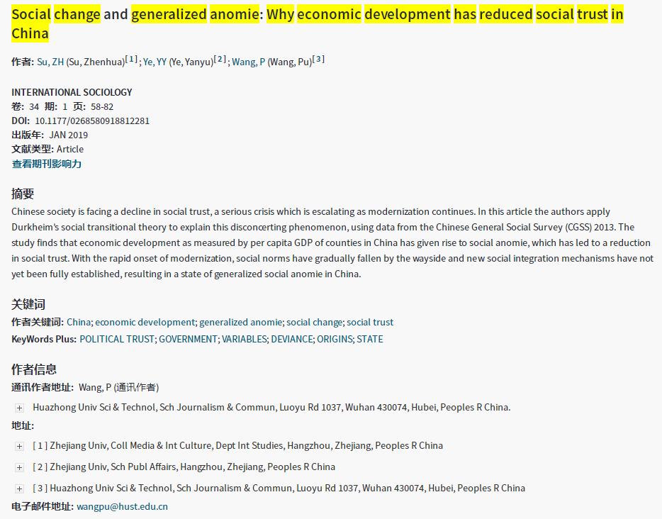 2019-01-01 苏振华;Ye, Yanyu;Wang, Pu INTERNATIONAL SOCIOLOGYChinese society is facing a decline in social trust, a serious crisis which is escalating as modernization continues. In this article the authors apply Durkheim’s social transitional theory to explain this disconcerting phenomenon, using data from the Chinese General Social Survey (CGSS) 2013. The study finds that economic development as measured by per capita GDP of counties in China has given rise to social anomie, which has led to a reduction in social trust. With the rapid onset of moderniz... 更多 -