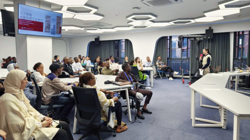 After the exchange, the international media professionals also visited the teaching site of the Film and Television Production Practice course. Some media professionals from Africa were already familiar with the course instructor and Hundred Talents Program researcher Zhang Yong. In the classroom, Zhang Yong shared his creative experiences in both China and Africa, using specific case studies. Later, lab instructor Qiu Huang demonstrated how AI tools can enhance traditional green screen production for the media professionals.